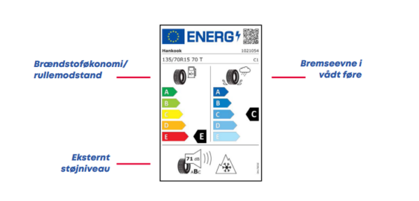 Her får du info om bilens bremseevner i vådt føre, bilens rullemodstand/brændstoføkonomi og det eksterne støjniveau. Her er A den bedste klasse, og E den dårligste.